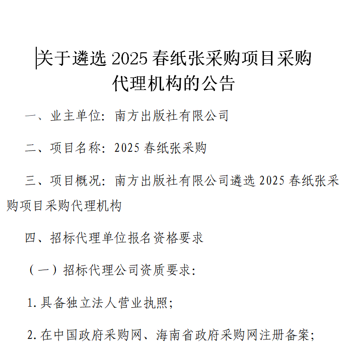 关于遴选2025春纸张采购项目采购 代理机构的公告