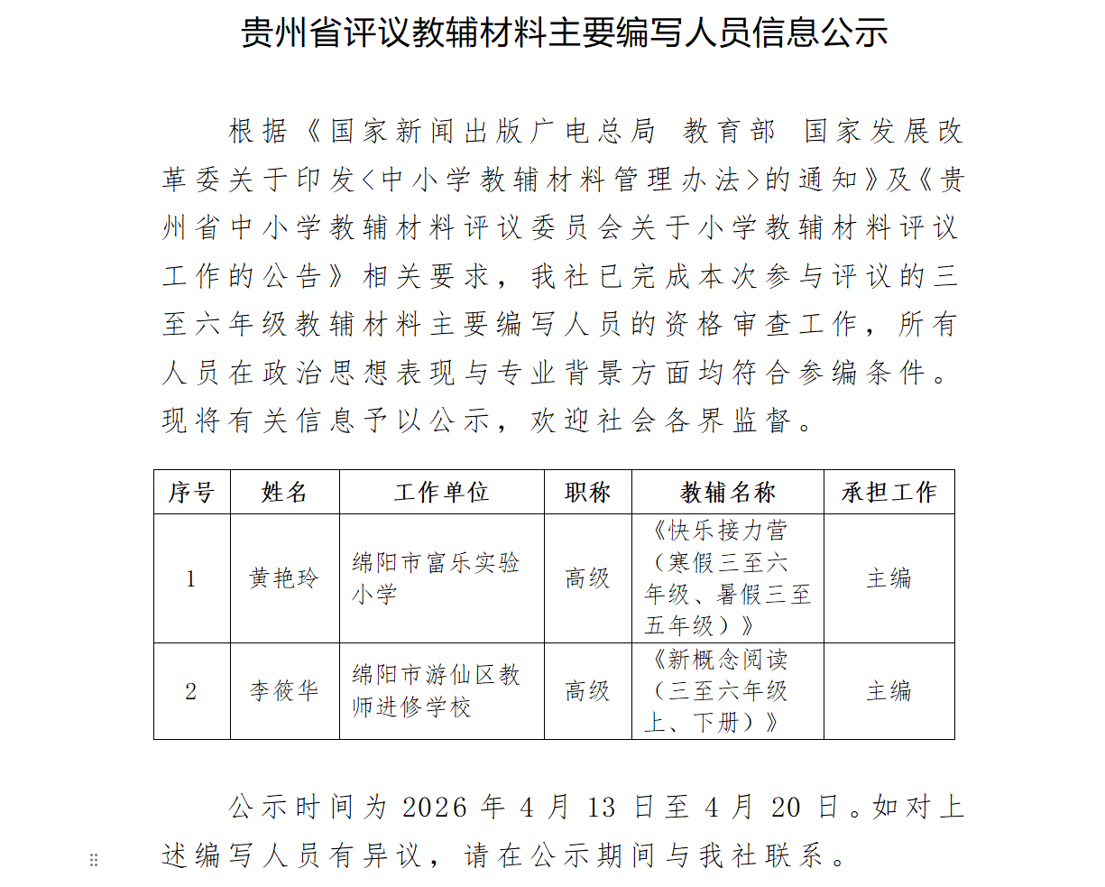 贵州省评议教辅材料主要编写人员信息公示